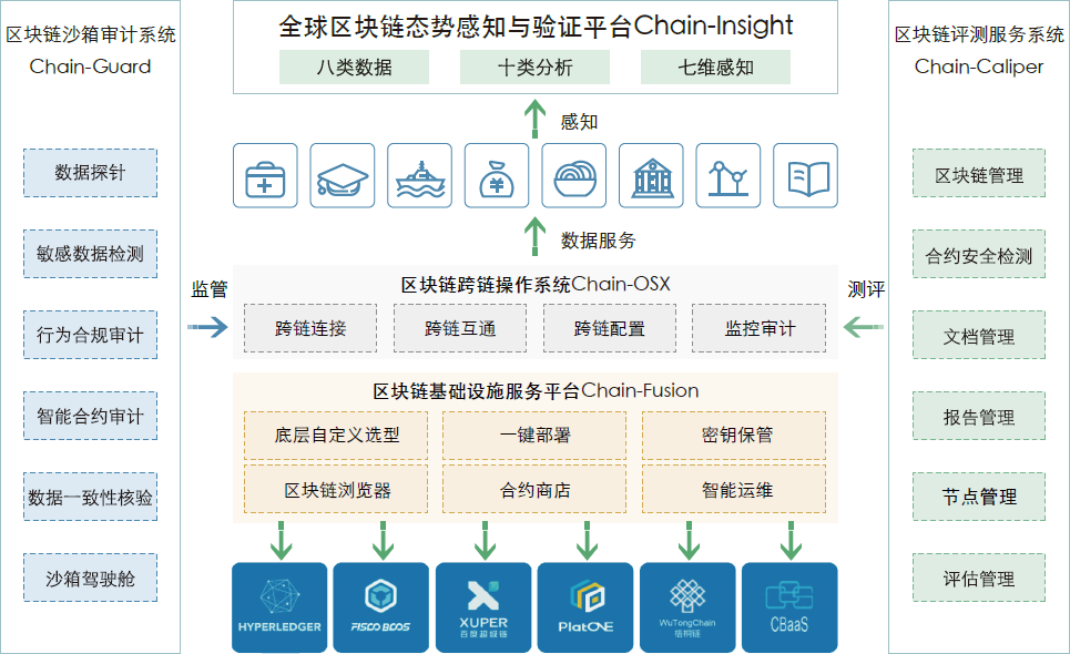 区块链平台能够满足区块链各个应用场景的系统开发、应用、测试和审计,主要包含区块链服务平台、区块链跨链操作系统、全球区块链态势感知与验证平台、区块链沙箱审计系统、区块链评测服务系统。该平台是面向企业级的全生态应用服务平台,提供一站式应用开发平台及服务,帮助客户及合作伙伴快速轻松的搭建各类业务场景下的区块链应用、测试和验证环境。