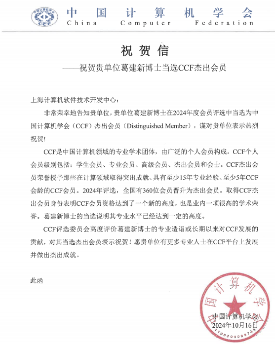 近日,中国计算机学会(CCF)2024年CCF杰出会员评选会在京召开。上海软件中心软件工程研究所葛建新博士晋升为CCF杰出会员。