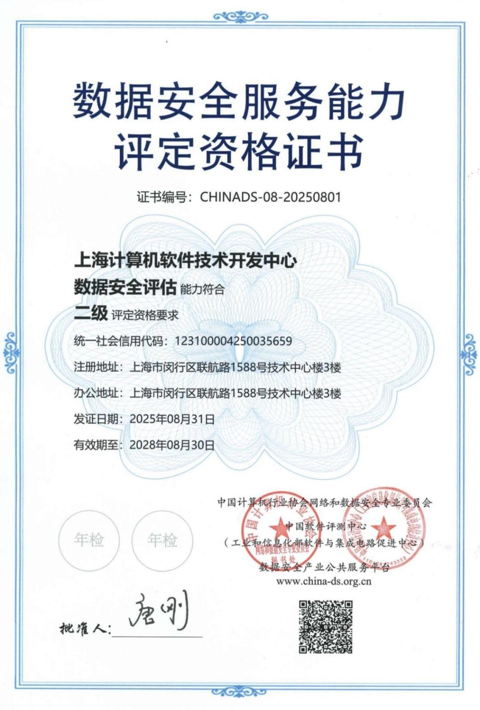 数据安全服务能力评定是对数据安全服务提供商在数据安全专业技能和服务能力方面的全面评估。本资质的顺利获得,为上海软件中心进一步拓展数据安全业务提供了有力支撑和规范性保障。未来,上海软件中心将在卓越管理体系下,深耕数据安全领域,持续提供优质的数据安全服务,为数字经济发展保驾护航。